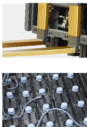 防止碰撞時產(chǎn)生電火花 貨叉、車體兩側(cè)及尾部易碰撞處都包有銅板